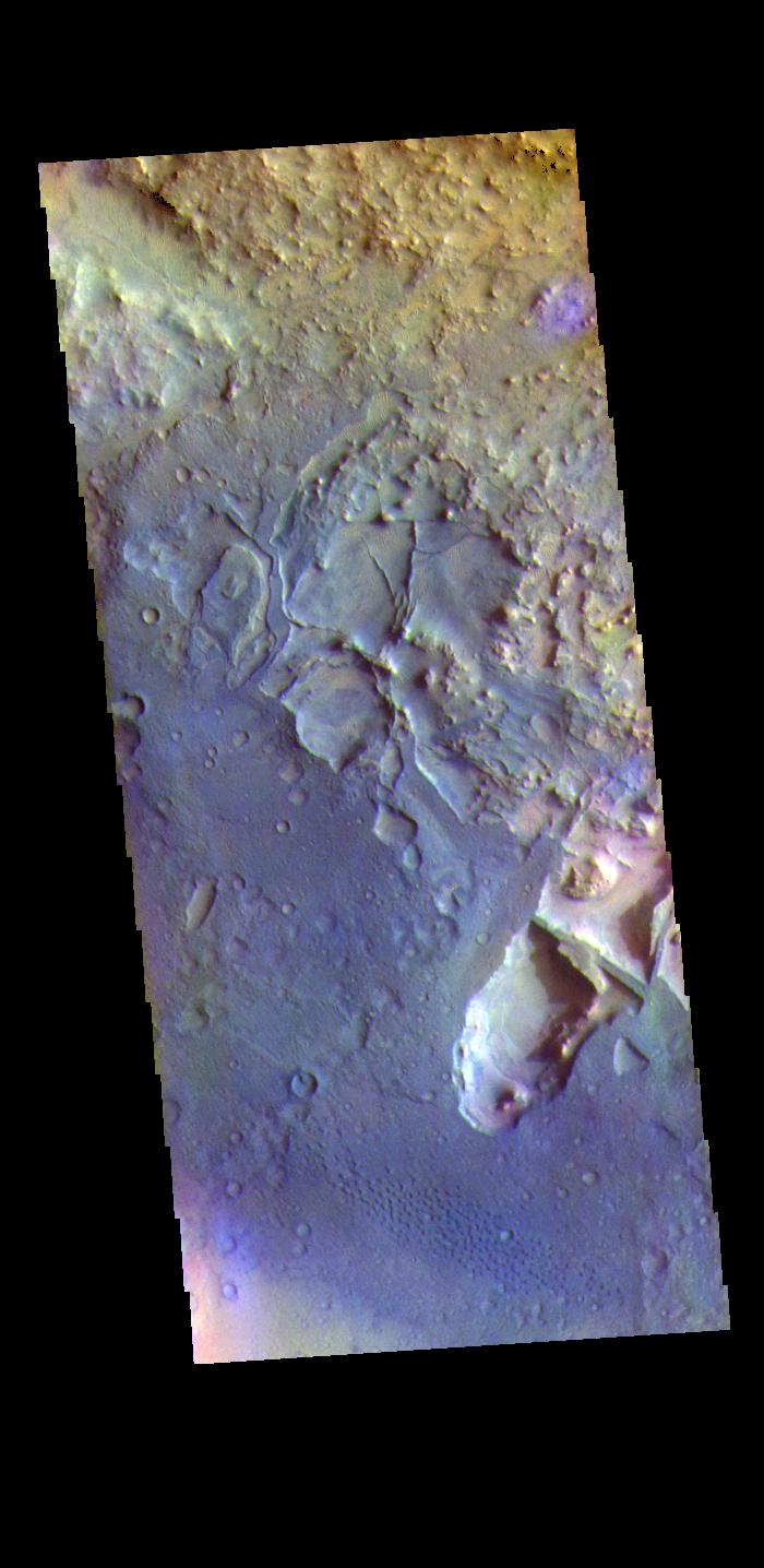 The THEMIS VIS camera contains 5 filters. The data from different filters can be combined in multiple ways to create a false color image. These false color images may reveal subtle variations of the surface not easily identified in a single band image. Today's false color image shows part of the floor of an unnamed crater in Terra Sabaea. The floor of the crater has several depressions, as well as small ridges, both caused by erosion.