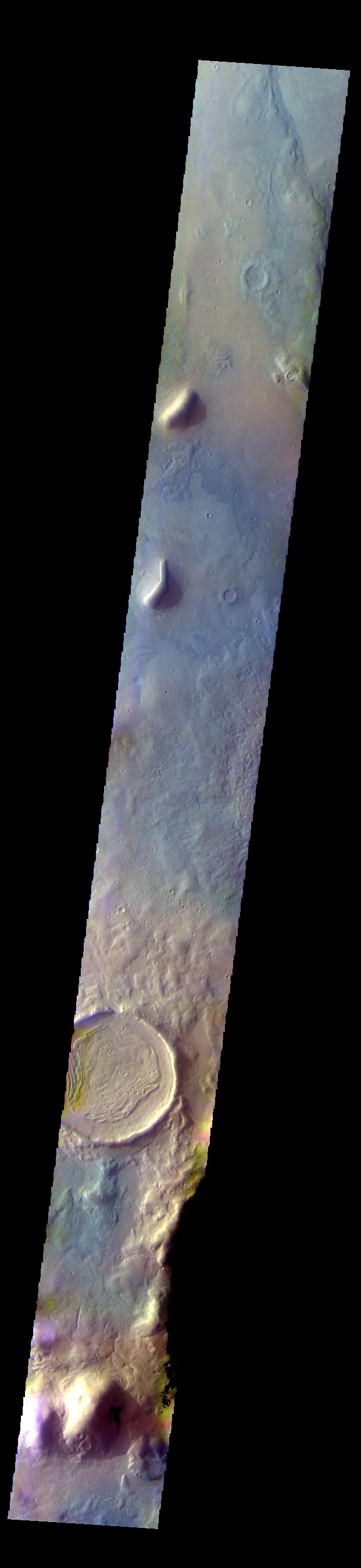 The THEMIS VIS camera contains 5 filters. The data from different filters can be combined in multiple ways to create a false color image. These false color images may reveal subtle variations of the surface not easily identified in a single band image. Today's false color image shows part of northern Terra Sabaea.