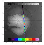 This image is TES thermal data (Orbit 222) overlayed on the MOLA DEM. The color scale is TES T18-T25, which is a cold spot index. The grey scale is MOLA elevation in kilometers. Most cold spots can be attributed to surface spectral emissivity effects. Regions that are colored black-violet-blue have near unity emissivity and are coarse grained CO2. Regions that are yellow-red are fined grained CO2. The red-white spot located approximately 300W85N is our most likely candidate for a CO2 snow storm.