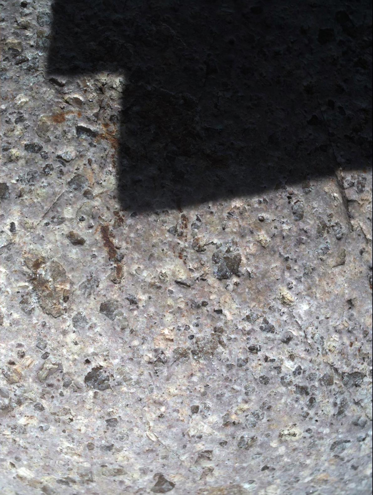 This close-up view of a stone found in San Diego was taken by a testing twin -- the "life test unit" -- of the Mars Hand Lens Imager (MAHLI) camera for NASA's Mars Science Laboratory. The image covers a patch of rock surface about 4 centimeters (1.6 inches) wide, with the shadow of the camera falling across part of the photographed area.