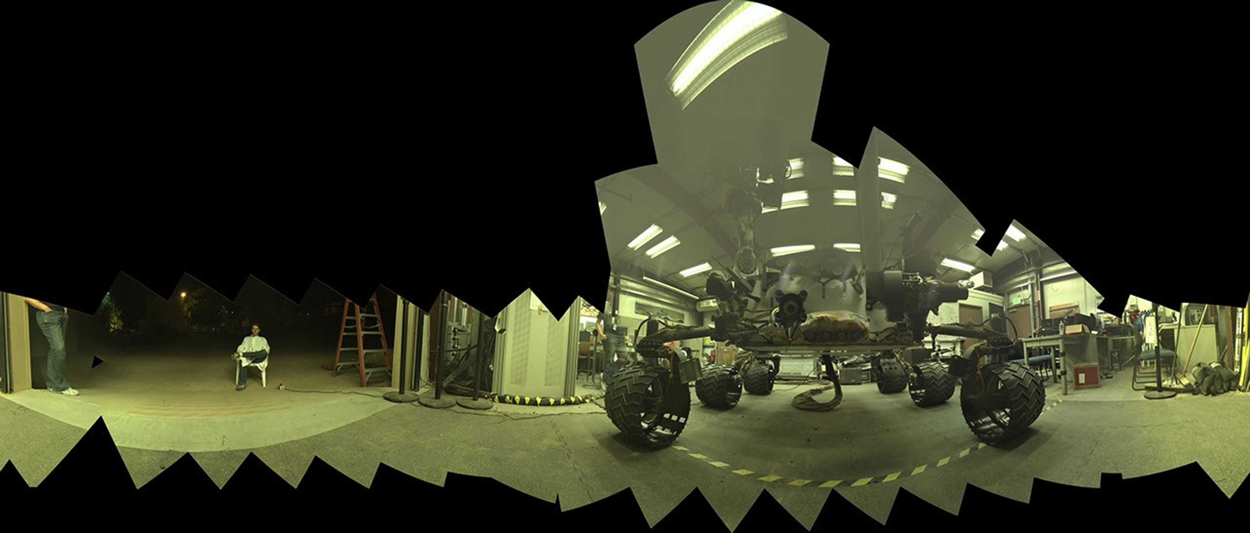 This view of a test rover at NASA's Jet Propulsion Laboratory, Pasadena, California, results from advance testing of arm positions and camera pointings for taking a low-angle self-portrait of NASA's Curiosity Mars rover.