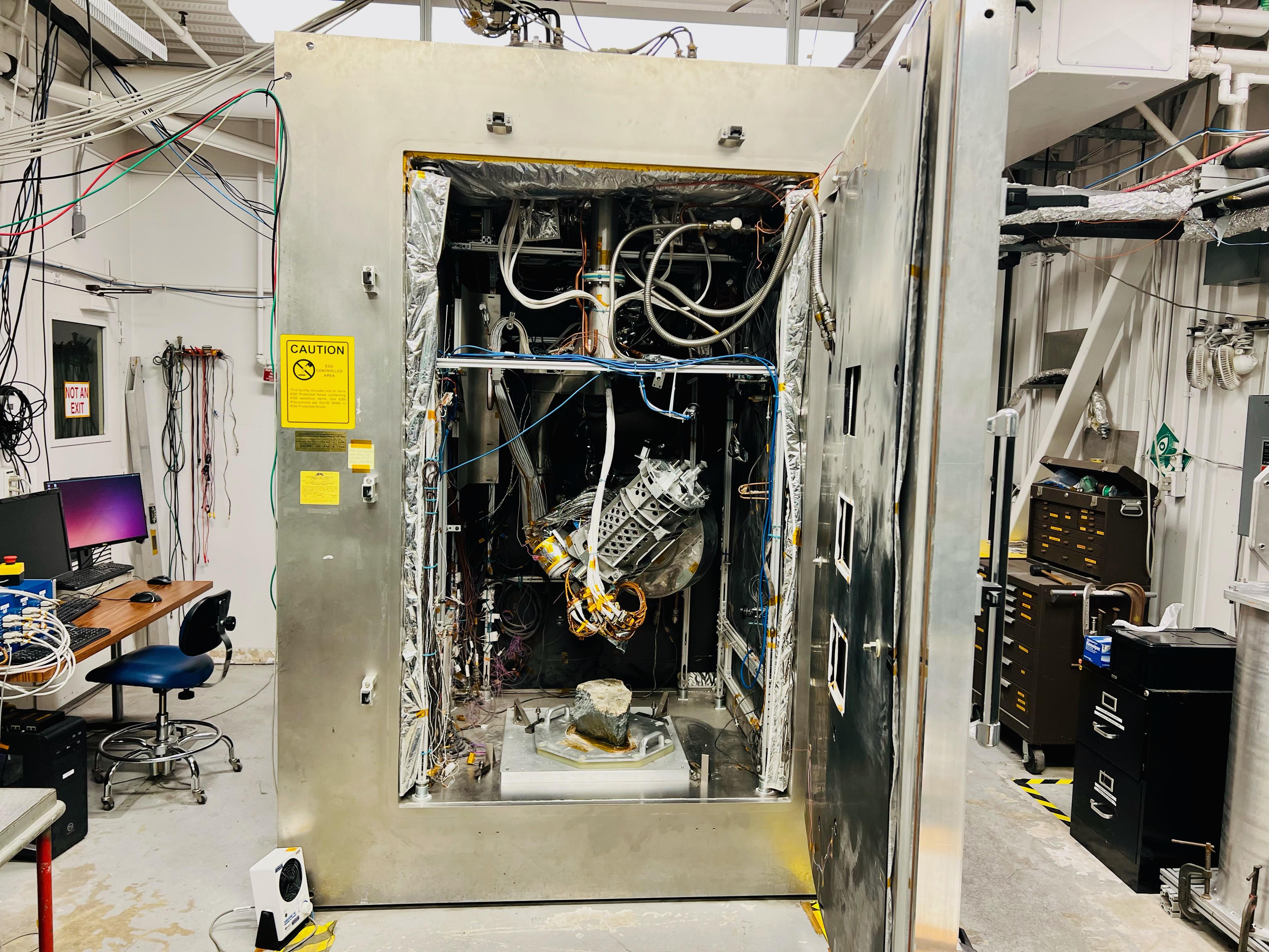 Engineers working with NASA's Perseverance Mars rover set up this test area at the agency's Jet Propulsion Laboratory in late 2021 to practice drilling into crumbly rocks using a duplicate of the rover's rock-coring drill. Perseverance's drill was designed to provide solid rock cores roughly the size of a piece of chalk; however, the rover's first sample, nicknamed "Roubion," collapsed into powder, prompting a test campaign.
