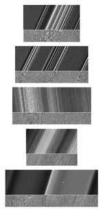 Images here show the sunlit side of Saturn's rings. A strip along the bottom of each image has been filtered so that the textures are more visible. The filter consists of averaging and then subtracting out the major brightness variations across the scene. The images illustrate how textures in Saturn's rings differ, even in close proximity. Cassini had previously discovered that straw-like clumpy textures are visible in the troughs of the strongest density waves, such as the Janus 6:5 wave in the outer A ring (at top of Figure 1A). Images from Cassini's Ring Grazing Orbits show that similar clumpy textures are also visible in the troughs of medium-size density waves, such as the (left to right) Prometheus 26:25, 27:26 and 28:27 waves, also in the outer A ring (Figure 1B).