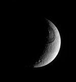 North on Tethys is up in this view. The lit portion of Tethys seen here is on the moon's leading hemisphere as it orbits Saturn.