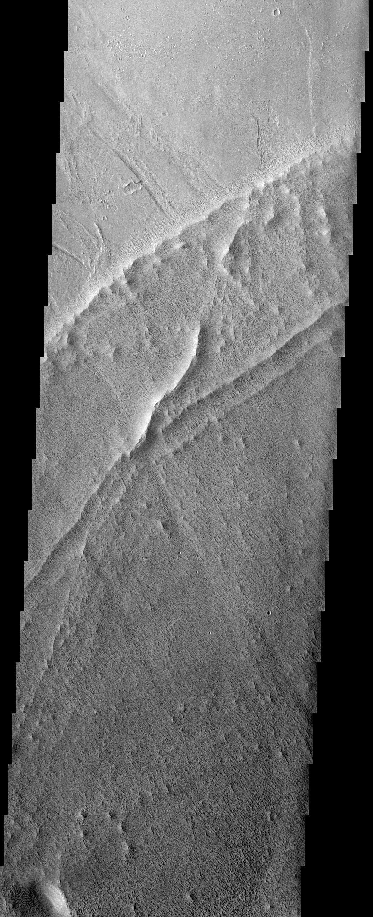 Note: this THEMIS visual image has not been radiometrically nor geometrically calibrated for this preliminary release. An empirical correction has been performed to remove instrumental effects. A linear shift has been applied in the cross-track and down-track direction to approximate spacecraft and planetary motion. Fully calibrated and geometrically projected images will be released through the Planetary Data System in accordance with Project policies at a later time.