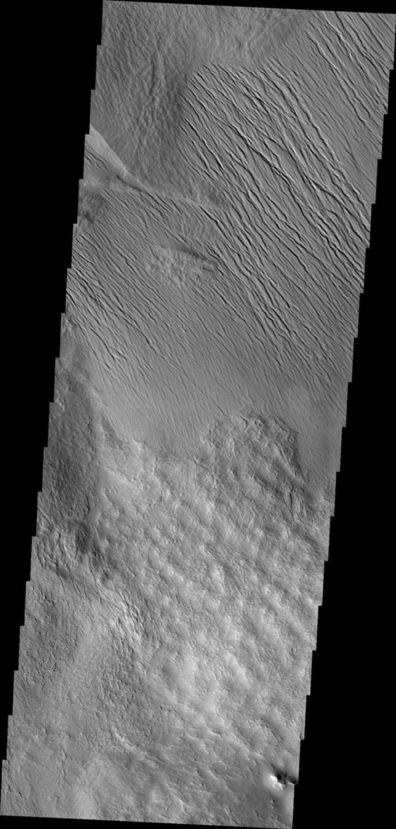 It is unclear what process has eroded the surface in this part of the Tharsis region. Wind is likely, but it could also be a record of water erosion.