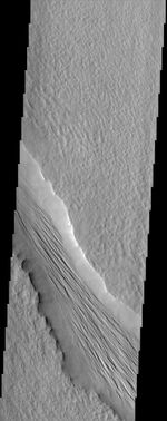 Note: this THEMIS visual image has not been radiometrically nor geometrically calibrated for this preliminary release. An empirical correction has been performed to remove instrumental effects. A linear shift has been applied in the cross-track and down-track direction to approximate spacecraft and planetary motion. Fully calibrated and geometrically projected images will be released through the Planetary Data System in accordance with Project policies at a later time.