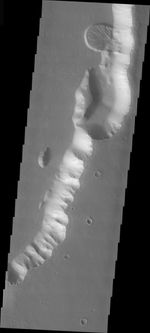 Note: this THEMIS visual image has not been radiometrically nor geometrically calibrated for this preliminary release. An empirical correction has been performed to remove instrumental effects. A linear shift has been applied in the cross-track and down-track direction to approximate spacecraft and planetary motion. Fully calibrated and geometrically projected images will be released through the Planetary Data System in accordance with Project policies at a later time.