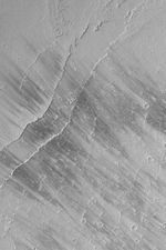This Mars Global Surveyor (MGS) Mars Orbiter Camera (MOC) picture shows dark wind streaks on a plain east of Olympus Mons in the Tharsis region of Mars. Streaks such as these change from time to time over the course of a martian year, suggesting that they are the result of wind movement of a thin layer of bright dust. In other words, wind is not moving dark material to make the dark streaks, it is removing bright material (thin coatings of dust). This picture is located near 16.3°N, 127.7°W. The image covers an area 3 km (1.9 mi) across and is illuminated by sunlight from the upper left.