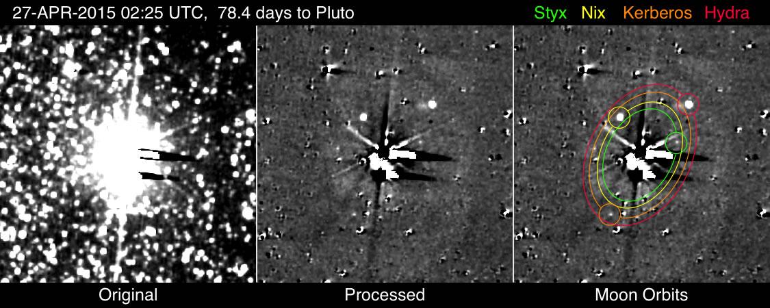 The images detecting Kerberos and Styx shown here were taken with New Horizons' most sensitive camera, the Long Range Reconnaissance Imager (LORRI), from April 25-May 1, 2015. Each observation consists of five 10-second exposures that have been added together to make the image in the left panel, and extensively processed to reduce the bright glare of Pluto and Charon and largely remove the dense field of background stars (center and right panels), in order to reveal the faint satellites, whose positions and orbits, along with those of the brighter moons Nix and Hydra, are given in the right panel.
