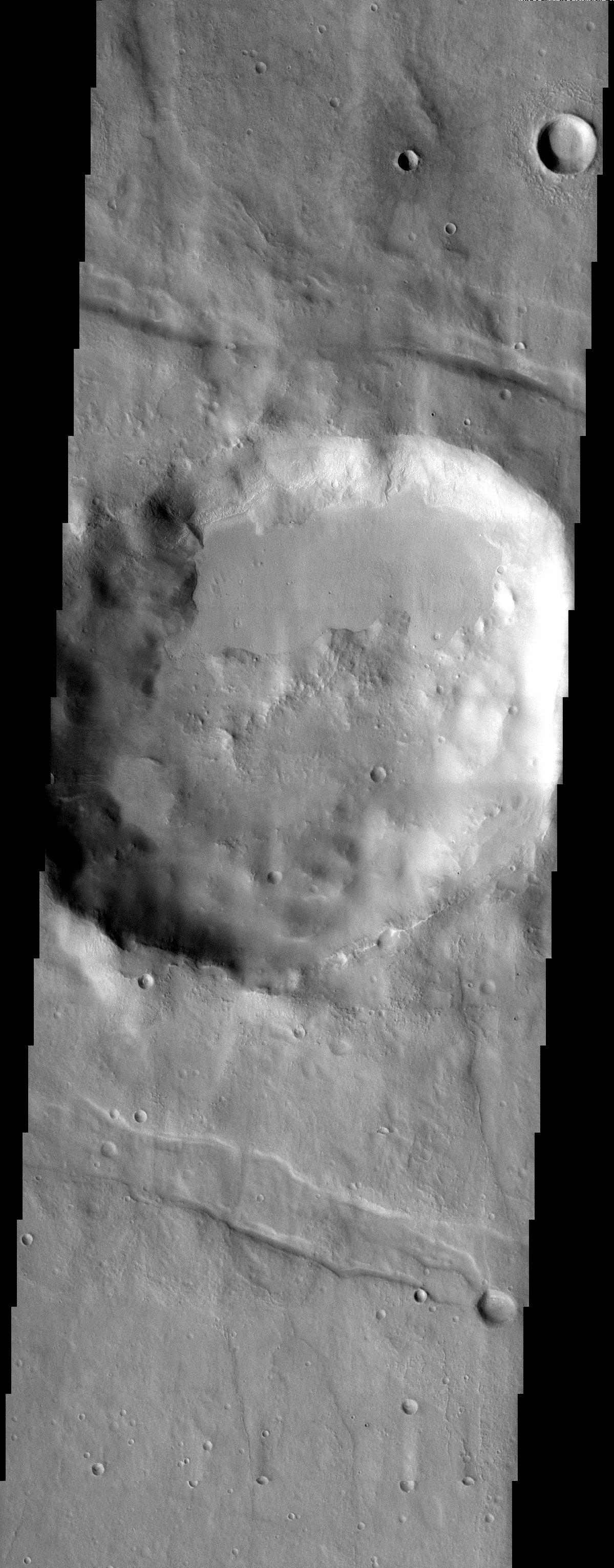 Note: this THEMIS visual image has not been radiometrically nor geometrically calibrated for this preliminary release. An empirical correction has been performed to remove instrumental effects. A linear shift has been applied in the cross-track and down-track direction to approximate spacecraft and planetary motion. Fully calibrated and geometrically projected images will be released through the Planetary Data System in accordance with Project policies at a later time.