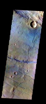 The THEMIS VIS camera contains 5 filters. The data from different filters can be combined in multiple ways to create a false color image. These false color images may reveal subtle variations of the surface not easily identified in a single band image. Today's false color image shows part of the plains of Thaumasia Planum.