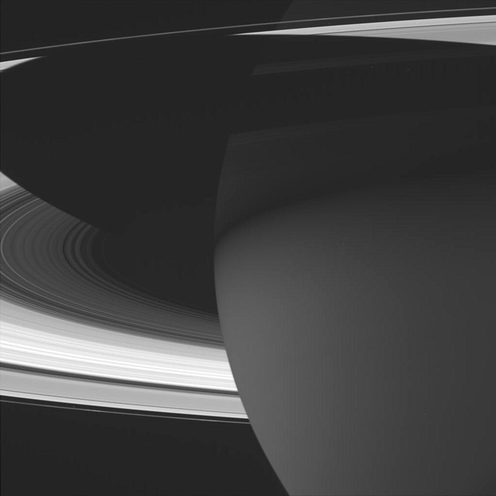 This majestic view of Saturn captures several phenomena of interest to scientists working on the Cassini mission. The planet's nighttime atmosphere looms ahead -- an excellent place to search for storms and lightning. Saturn's shadow stretches across the rings, which will over the next four years receive their most thorough examination since Galileo discovered them in 1610. And barely visible near lower right just inside the F ring, is the small shepherd moon Prometheus (102 kilometers, or 63 miles across). Researchers will explore the many moons of Saturn, including special ones like Prometheus that help maintain some of the rings and gaps in this complex and dynamic system.