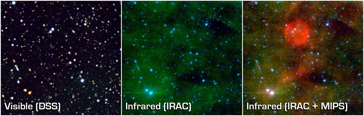 These three panels (figure 1) illustrate just how shy this star is. Unlike most supernova remnants, which are detectable at a variety of wavelengths ranging from radio to X-rays, this source only shows up in mid-infrared images taken by Spitzer's multiband imaging photometer. The remnant can be seen as a red-orange blob at the center of the picture (figure 4).