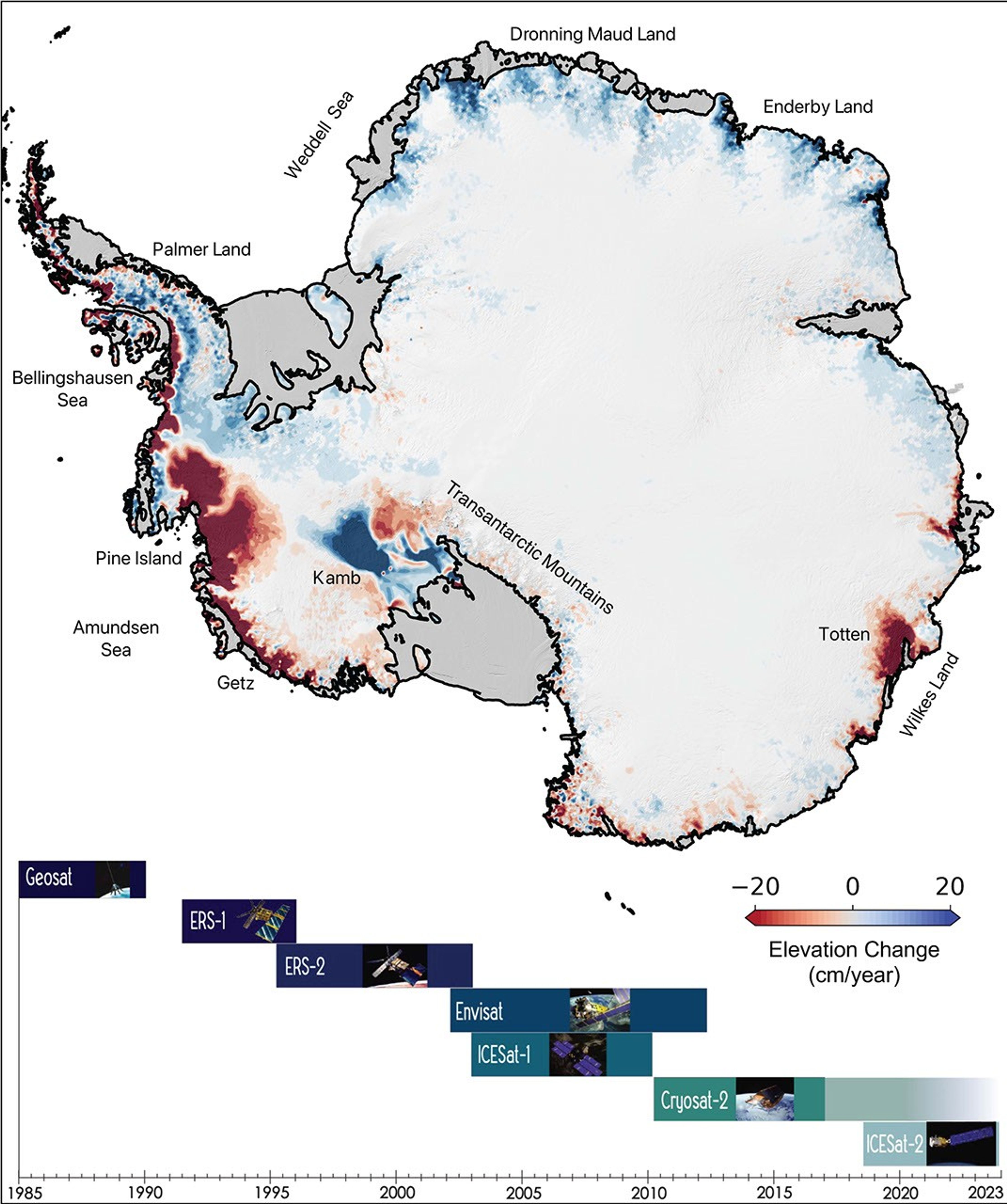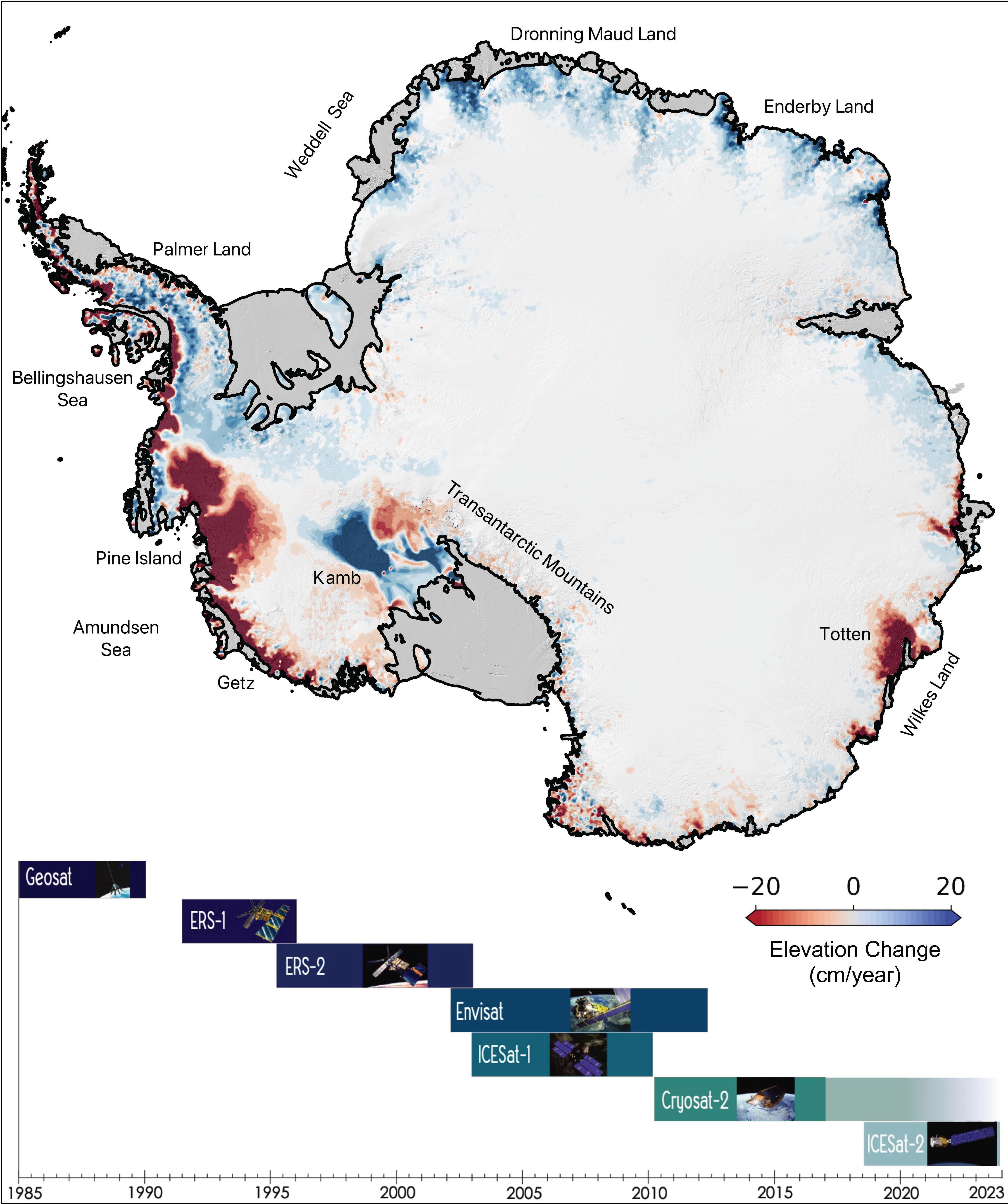 Ice height diminishes (shown in red) as the ice sheet melts by contact with ocean water; ice height rises (shown in blue) where accumulation exceeds ice loss. Ice shelves are shown in gray.