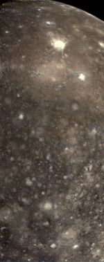 False color view of a portion of the leading hemisphere of Jupiter's moon Callisto as seen through the infrared filters of the Solid State Imaging (CCD) system aboard NASA's Galileo spacecraft. North is to the top of the picture and the sun illuminates the surface from the east. More recent impacts have excavated bright, relatively clean ice from beneath Callisto's battered surface. Callisto's dark mottled appearance may be due to contamination by non-ice components contributed by impactors or concentrated in a residue as ice is removed. This color composite image is centered on longitude 139 West and encompasses an area about 1000 miles (1600 kilometers) by 2470 miles (4000 kilometers). The images were obtained on November 3rd, 1996.