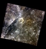 This color view of Mercury's surface highlights what may be an old volcanic vent. Just to the right of center, within a brown-red patch, is an irregularly shaped 30-km depression depression, in this case the irregular shape is a bit like a butterfly. While most of these suspected volcanic vents are located within impact craters (like this one), the butterfly-shaped vent is not clearly associated with any crater. It also appears that it may be older than other vents, resulting in more subdued details and colors.