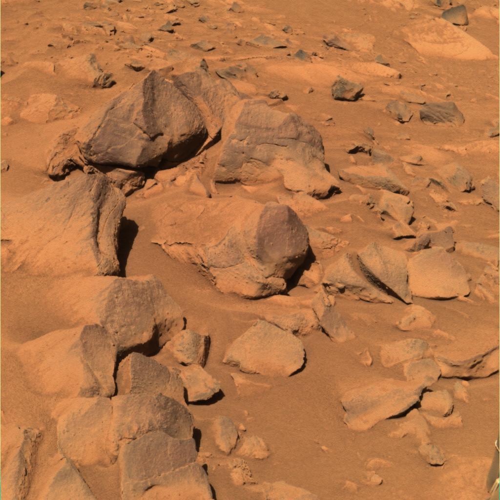 This approximate true-color rendering from NASA's Mars Exploration Rover Spirit shows a set of darker rocks dubbed "Toltecs" lying southeast of the rover's current position. These rocks are believed to be basaltic, or volcanic, in composition, because their spectral properties match those of other basaltic rocks studied in Gusev Crater. Scientists hope to use these presumably unaltered rocks as a geologic standard for comparison to altered rocks in the area, such as "Clovis." This image was taken with the panoramic camera's 600-, 530-, and 480-nanometer filters on sol 220 (Aug. 15, 2004).