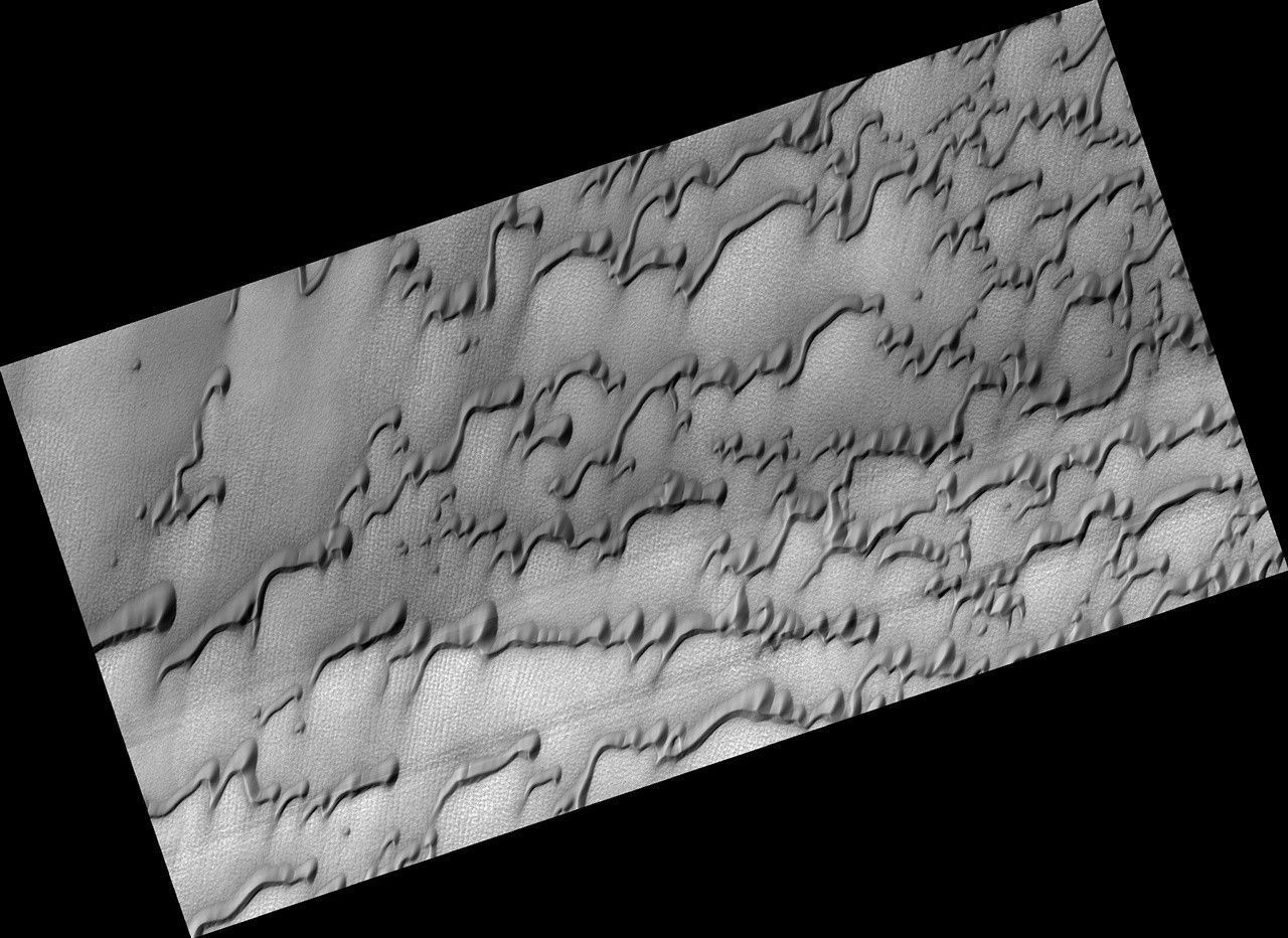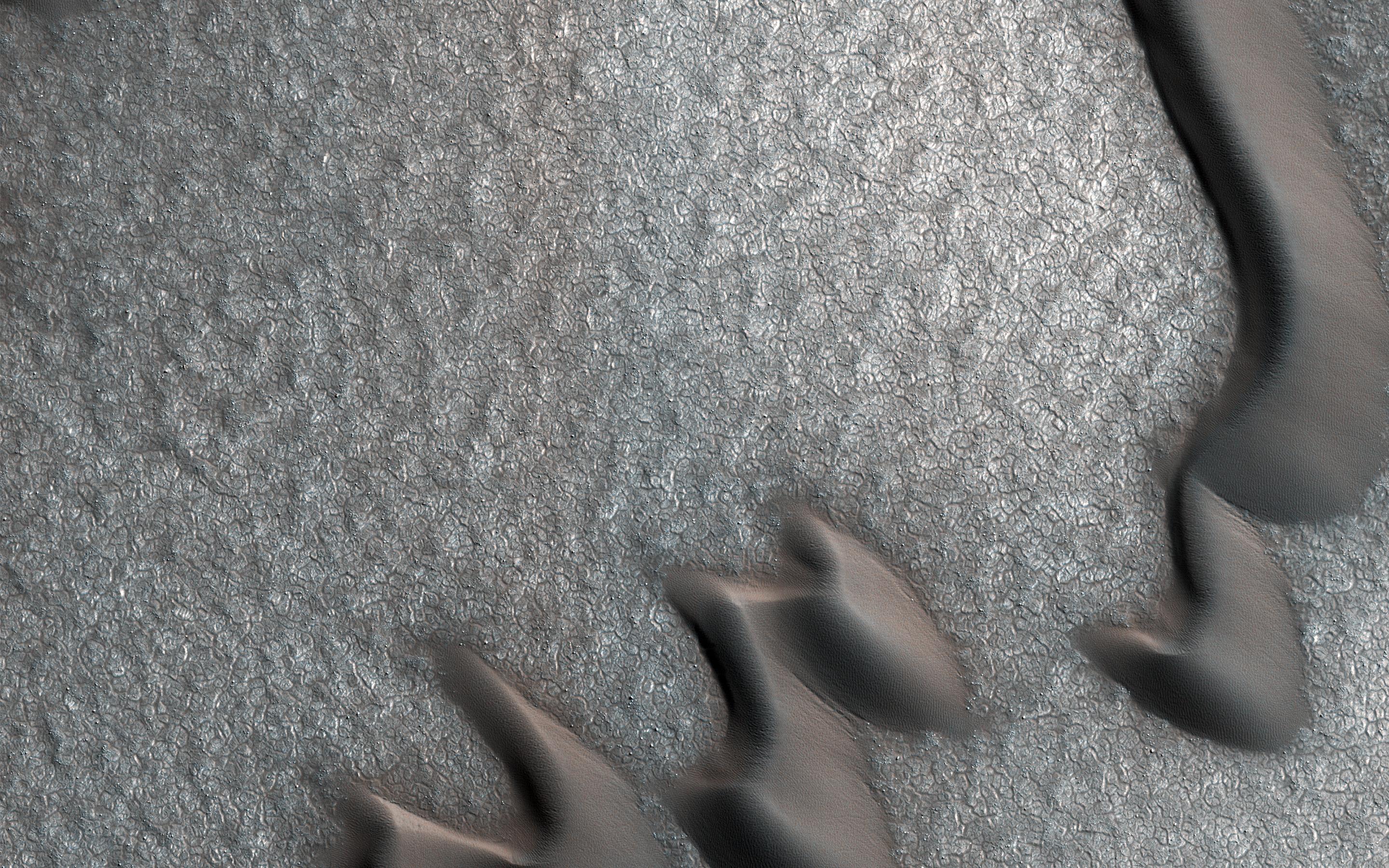 This image from NASA's Mars Reconnaissance Orbiter (MRO) was originally meant to track the movement of sand dunes near the North Pole of Mars, but what's on the ground in between the dunes is just as interesting!