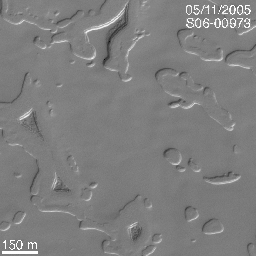 The south polar residual cap of Mars is composed of layered, frozen carbon dioxide. In 1999, the Mars Global Surveyor (MGS) Mars Orbiter Camera (MOC) showed that the carbon dioxide layers have been eroded to form a variety of circular pits, arcuate scarps, troughs, buttes, and mesas. In 2001, MOC images designed to provide repeated views of the areas imaged in 1999 -- with the hope of creating stereo (3-D) images, so that the height of scarps and depth of pits could be measured -- showed that the scarps had retreated, pits enlarged, and buttes and mesas shrank. Only carbon dioxide is volatile enough in the martian environment to have caused such dramatic changes -- the scarps were seen to retreat at an average rate of 3 meters (about 3 yards) per Mars year. Most of the scarp retreat occurs during the southern summer season; in some areas the scarps move as much as 8 meters, in others, only 1 meter per Mars year.