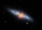 A composite image of the Cigar Galaxy (also called M82), a starburst galaxy about 12 million light-years away in the constellation Ursa Major. The magnetic field detected by the High-resolution Airborne Wideband Camera-Plus instrument (known as HAWC+) on SOFIA (the Stratospheric Observatory for Infrared Astronomy), shown as streamlines, appears to follow the bipolar outflows (red) generated by the intense nuclear starburst. The image combines visible starlight (gray) and a tracing of hydrogen gas (red) observed from the Kitt Peak Observatory, with near-infrared and mid-infrared starlight and dust (yellow) observed by SOFIA and the Spitzer Space Telescope.