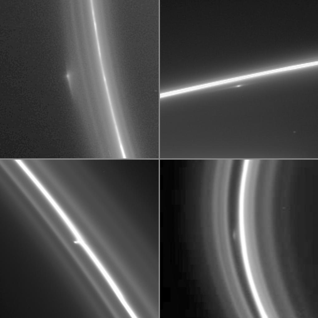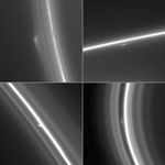 The upper left image was taken on June 21, 2005, and shows an object in the outer ringlets of the F ring. The radial (or lengthwise) extent of the feature is approximately 2,000 kilometers (1,200 miles). The radial resolution on the ring is about 13 kilometers (8 miles) per pixel.