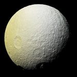 The color of the surface changes conspicuously across the disk, from yellowish hues to nearly white. These broad color changes are affected by a number of external processes. First, Saturn's diffuse E-ring preferentially bombards Tethys' leading hemisphere, toward the right side of this image, with ice bright ice grains. At the same time, charged particles from Saturn's radiation belt bombard the surface on the trailing side, causing color changes due to chemical alteration of the materials there. The albedo -- a measure of the surface's reflectivity -- drops by 10 to 15 percent from the moon's leading side to the trailing side. Similar global color patterns exist on other Saturnian moons.