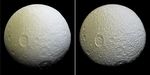 The color of the surface can be seen to change across the disk, from yellowish hues to nearly white. These broad color changes are affected by a number of external processes. First, Saturn's diffuse E-ring preferentially bombards Tethys' leading hemisphere, toward the right side in this image, with ice bright ice grains. At the same time, charged particles from Saturn's radiation belt bombard the surface on the trailing side, causing color changes due to chemical alteration of the materials there. The albedo -- a measure of the surface's reflectivity -- drops by 10 to 15 percent from the moon's leading side to the trailing side. Similar global color patterns exist on other Saturnian moons.