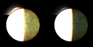 The nightside of Io (left panel) is illuminated brightly enough by Jupiter to reveal many details in full color to MVIC's sensitive vision. The nightside color has been corrected to account for the greenish hue of Jupiter's light as seen by MVIC -- see the April 2 Featured Image of Io and Europa (