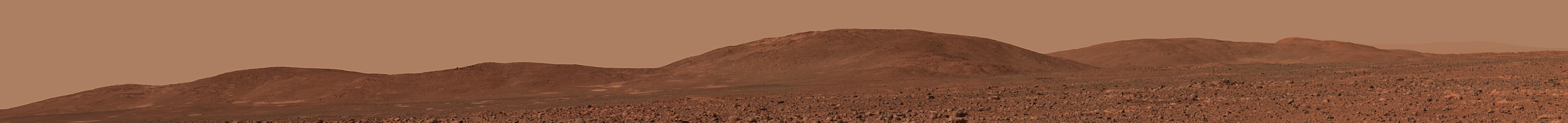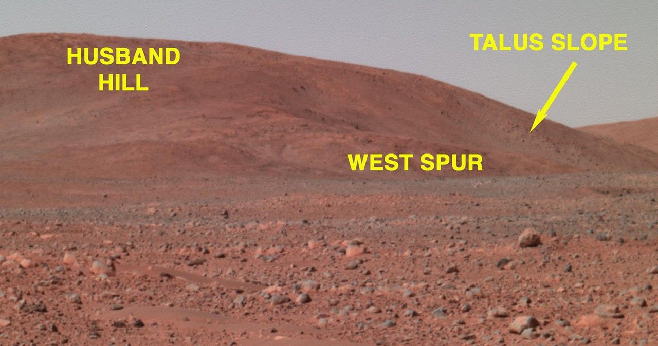 This image from the panoramic camera on NASA's Mars Exploration Rover Spirit shows a forward-looking view of a portion of the "Columbia Hills." This portion features "Husband Hill" to the left, "West Spur" in the center, and a talus (rock debris) slope to the right. West Spur is Spirit's planned first stop at the hills. Husband Hill measures approximately 90 meters (295 feet) tall from the base of the hills to its highest peak. Even in this distant shot, taken on sol 135 (May 20, 2004) from approximately 0.7 kilometers (0.4 miles) away from the base of the hills, large boulders can be seen on the hillside. These boulders are of great interest to scientists, as they may reveal clues about how these hills formed.