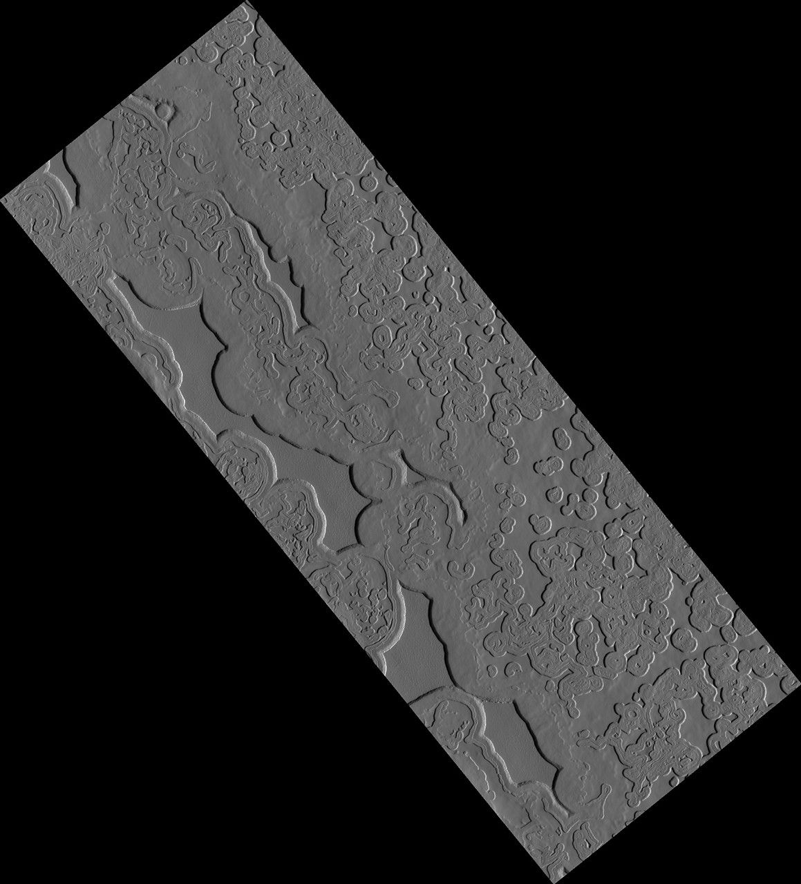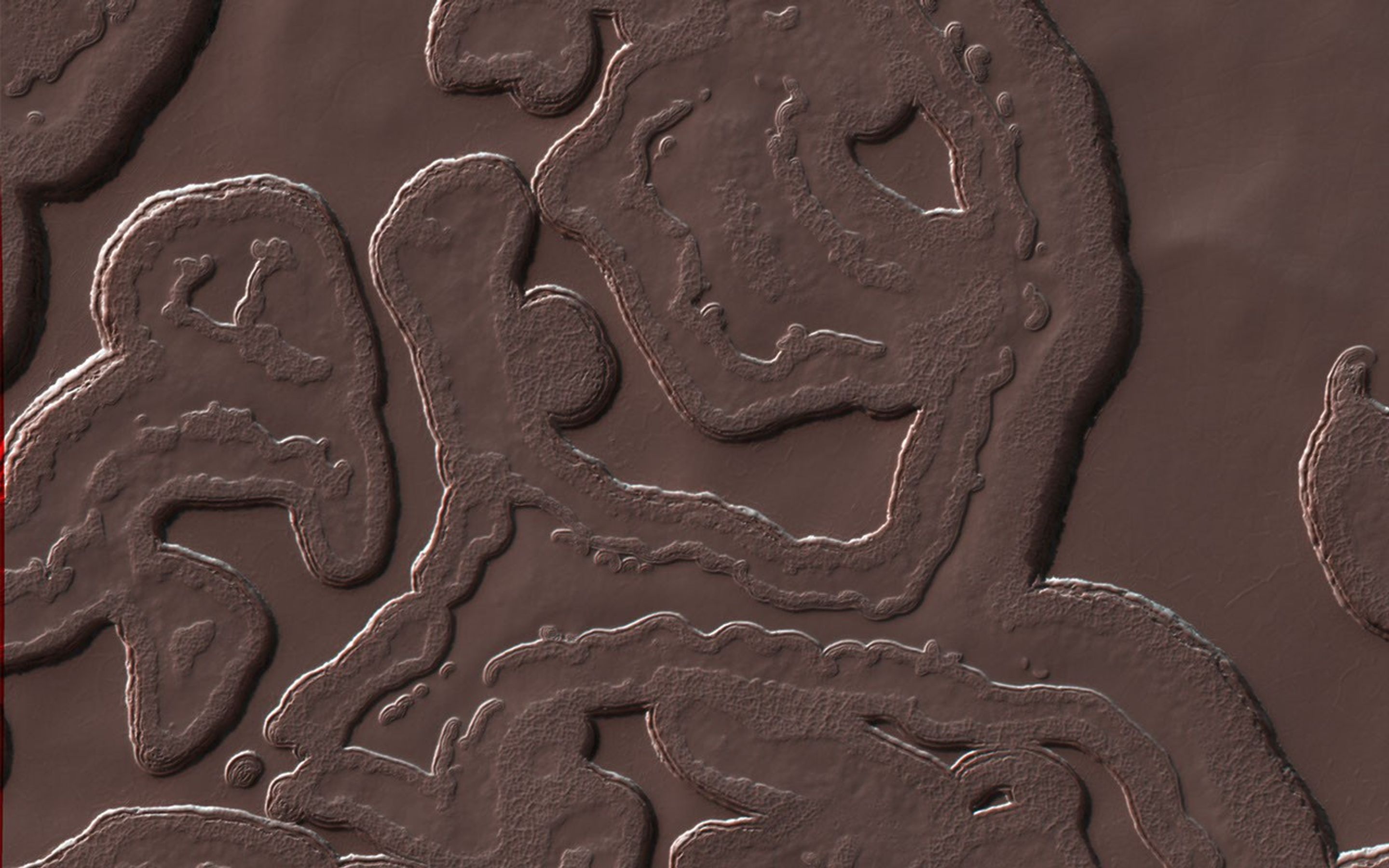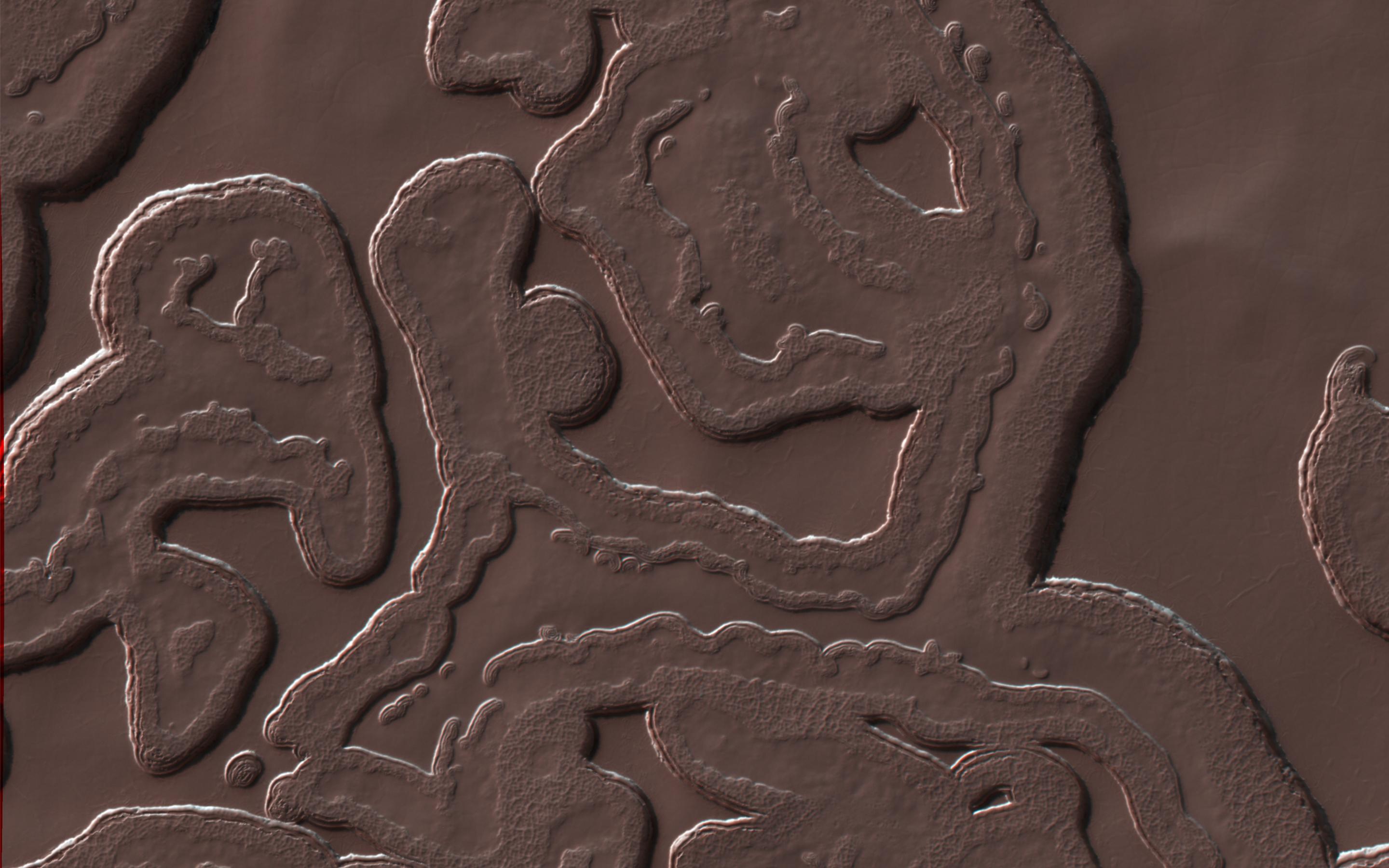 However, Mars has an exotic side too, with landscapes that are alien to Earthlings. This image shows one of these exotic locales at the South Pole. The polar cap is made from carbon dioxide (dry ice), which does not occur naturally on the Earth. The circular pits are holes in this dry ice layer that expand by a few meters each Martian year.