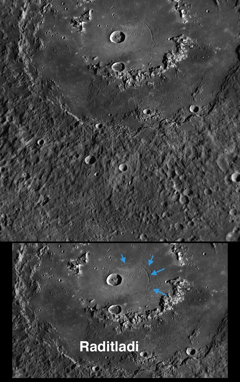 Raditladi basin, imaged during MESSENGER's first Mercury flyby and named in April 2008 (PIA10611), is intriguing for several reasons. Shown extending across the top of this high-resolution NAC image, Raditladi basin is relatively young, with only a few small impact craters on the basin's floor and with well-preserved basin walls and peak-ring structure. Visible on the floor of Raditladi are concentric troughs (blue arrows), formed by extension (pulling apart) of the surface. However, extensional troughs on Mercury are quite rare, having been seen to date only in two other locations on the planet: as part of Pantheon Fossae and other troughs in Caloris basin (PIA11077) and on the floor of Rembrandt, the large basin discovered during MESSENGER's second Mercury flyby (PIA11769). Understanding how these troughs formed in the young Raditladi basin could provide an important indicator of processes that acted relatively recently in Mercury’s geologic history. Raditladi basin was the topic of one of 25 presentations made by MESSENGER team members at the 40th Lunar and Planetary Science Conference held last week.