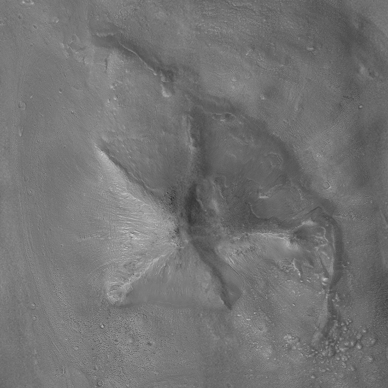Although it is not really shaped like a pyramid, the Cydonia landform is one of thousands of massifs, buttes, mesas, knobs, and blocks that mark the transition from the far northwestern Arabia Terra cratered highlands down to the northeastern Acidalia Planitia lowlands. Each block, whether shaped like a face, a pyramid, or simply a mesa, massif, or knob, is a remnant of the bedrock of northeastern Arabia that was left behind as erosion slowly degraded the terrain along this zone between the highlands and the lowlands. A few outcroppings of layers in this ancient bedrock can be seen in the mosaic of the pyramid-like landform shown here; much of the landform is covered with eroded mantling material that was deposited long after this highlands remnant became an isolated feature in Cydonia.