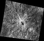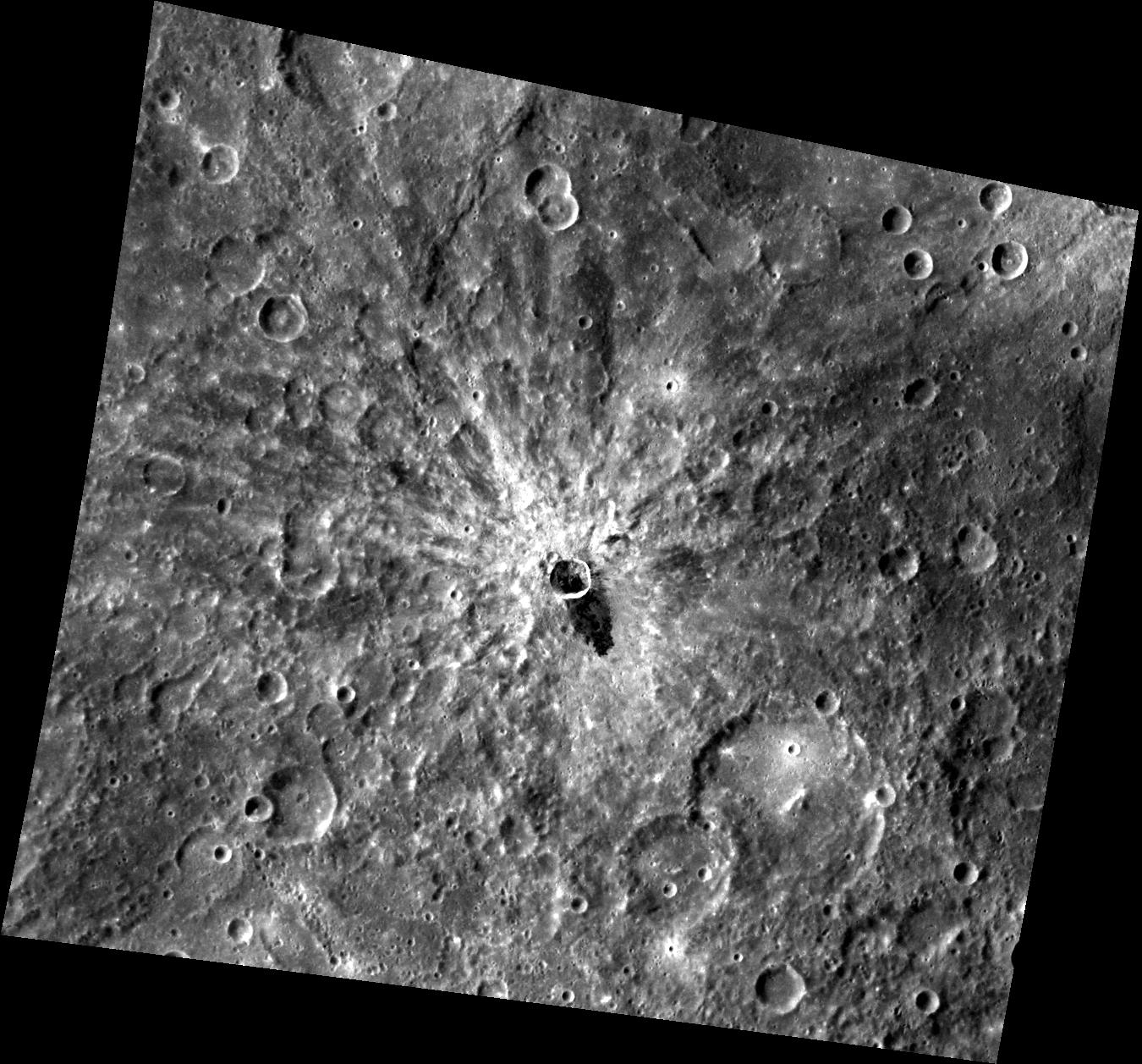 The bright rayed crater that dominates this image contains a darker material that appears to be impact melt that flowed out of the crater. This low reflectance material is increasingly identified as more of Mercury's surface is revealed in detail by MESSENGER images. Other areas that display low reflectance material include Derain and Matabei, though those dark deposits appear to have formed differently than the impact melt flow shown here.