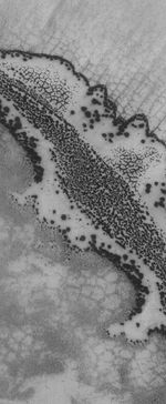 This Mars Global Surveyor (MGS) Mars Orbiter Camera (MOC) image shows varied springtime patterns formed in defrosting, seasonal carbon dioxide frost in the south polar region of Mars. The feature sporting an outline of dark spots and an interior of smaller, closely-spaced dark spots and dark-outlined polygons is a patch of windblown or wind-eroded sand that was covered by carbon dioxide frost during the previous autumn and winter. The fainter, larger polygon pattern on either side of the patch of defrosting sand is formed in the substrate upon which the sand patch is sitting. Polygonal forms such as these might indicate the presence of ice below the surface.