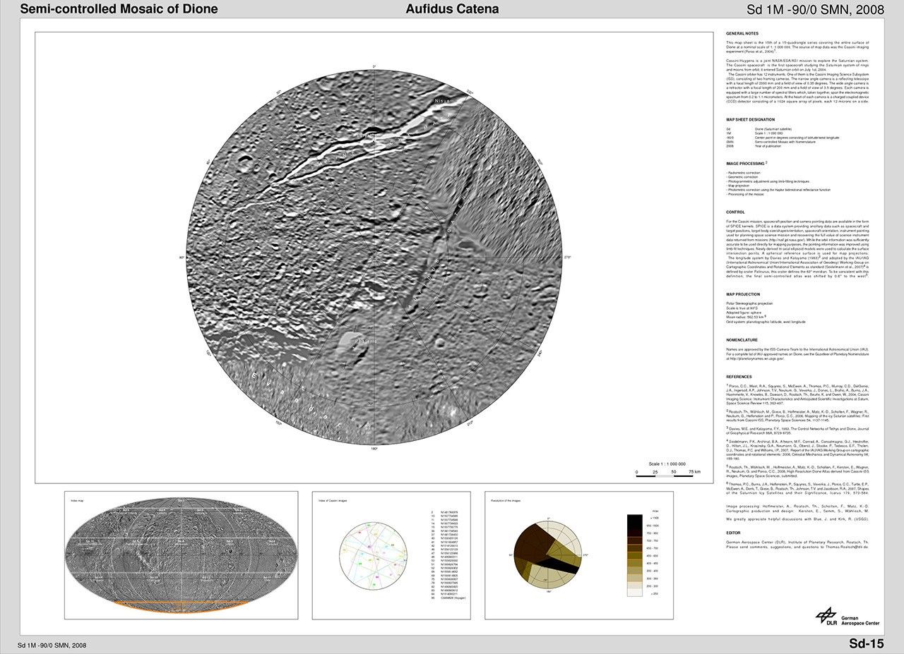 Presented here is a complete set of cartographic map sheets from a high-resolution Dione atlas, a project of the Cassini Imaging Team. The map sheets form a 15-quadrangle series covering the entire surface of Dione at a nominal scale of 1:1,000,000. An index for the atlas is included here, along with an unlabeled version of each terrain section. The map data was acquired by the Cassini imaging experiment. The mean radius of Dione used for projection of the maps is 562.53 kilometers (349.54 miles). Names for features have been approved by the International Astronomical Union.