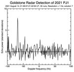 The figure shows radar echo signal strength on the vertical axis versus Doppler frequency (in units of hertz, or Hz) on the horizontal axis. The strong spike at a value of minus 70 Hz is the reflected signal (or "echo") from 2021 PJ1; the other, smaller spikes are receiver noise, which is like the static on an AM radio if there aren't any nearby stations.