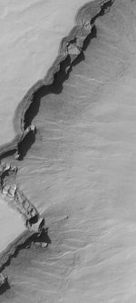 This Mars Global Surveyor (MGS) Mars Orbiter Camera (MOC) image shows the edge (running diagonally from the lower left to the upper right) of a trough, which is part of a large pit crater complex in Noachis Terra. This type of trough forms through the collapse of surface materials into the subsurface, and often begins as a series of individual pit craters. Over time, continued collapse increases the diameter of individual pits until finally, adjacent pits merge to form a trough such as the one captured in this image. The deep shadowed area is caused in part by an overhang; layered rock beneath this overhang is less resistant to erosion, and thus has retreated tens of meters backward, beneath the overhang. A person could walk up inside this "cave" formed by the overhanging layered material.