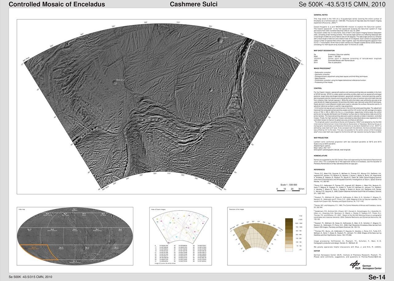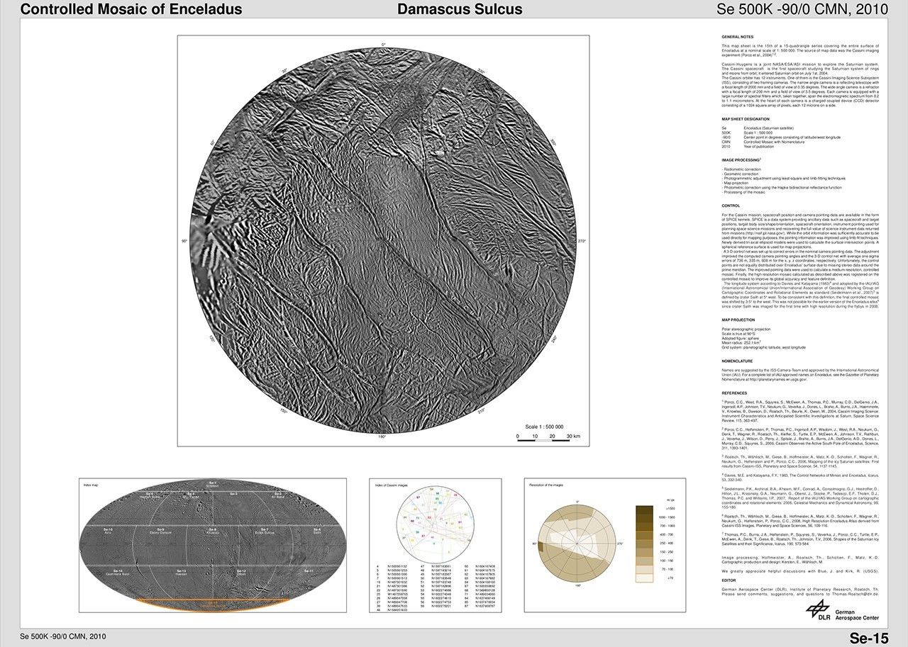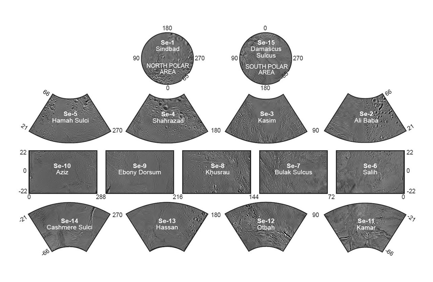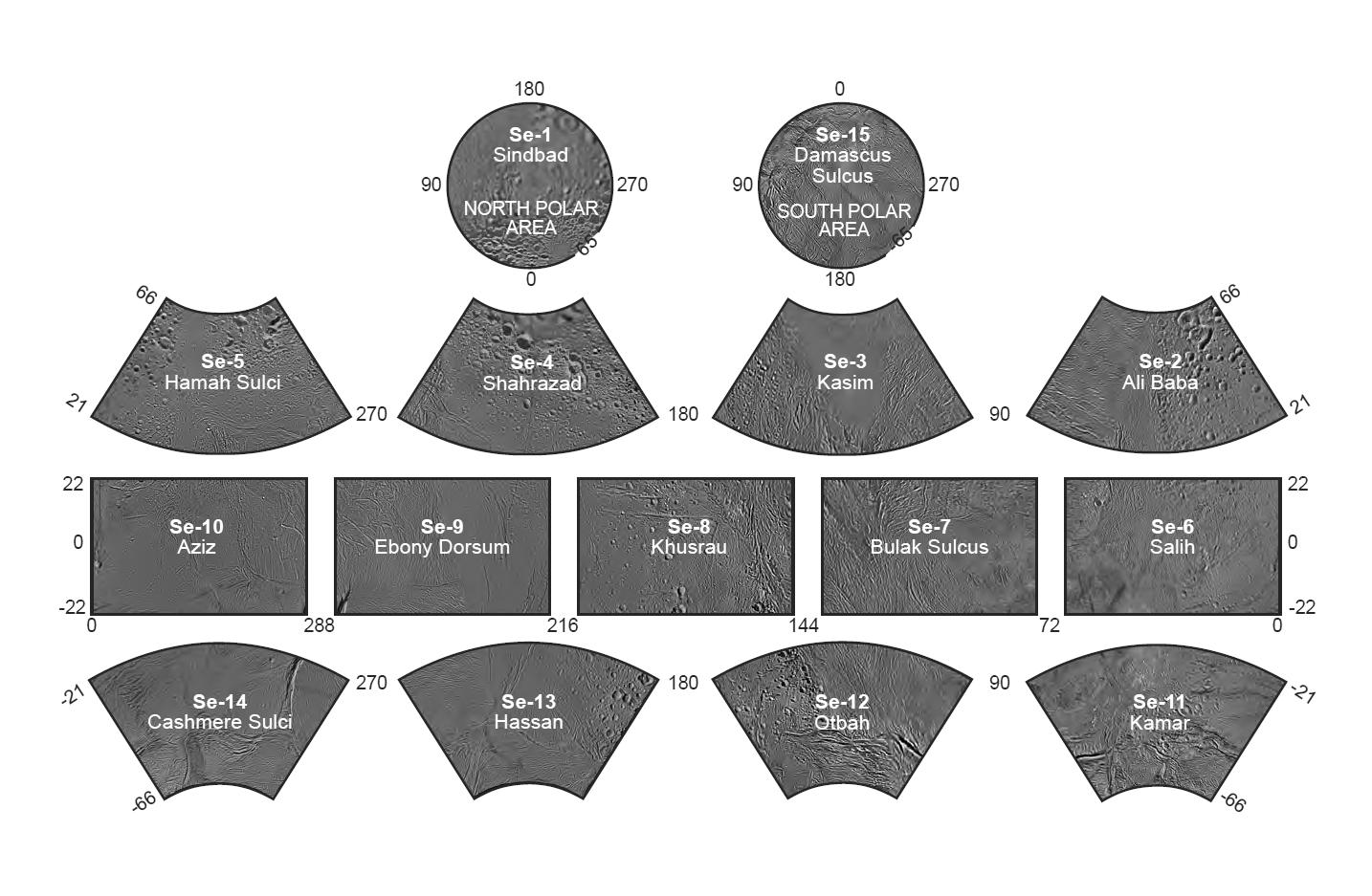 The map sheets form a 15-series covering the entire surface of Enceladus at a nominal scale of 1:500,000. An index for the atlas is included here, along with an unlabeled version of each terrain section. The map data was acquired by the Cassini imaging experiment. The mean radius of Enceladus used for projection of the maps is 252.1 kilometers (156.6 miles). Names for features have been approved by the International Astronomical Union (IAU).