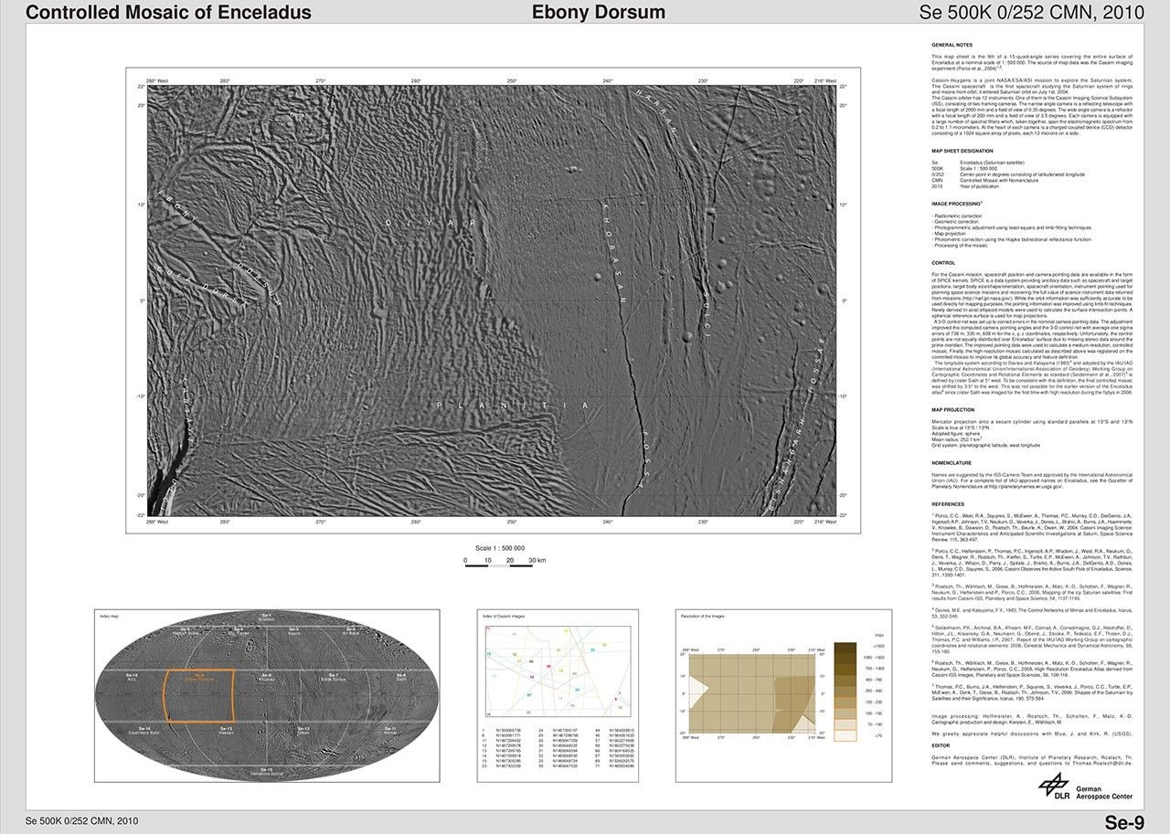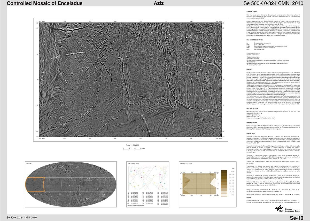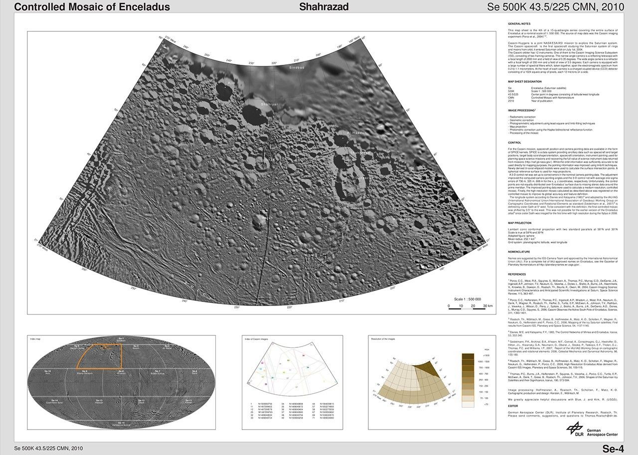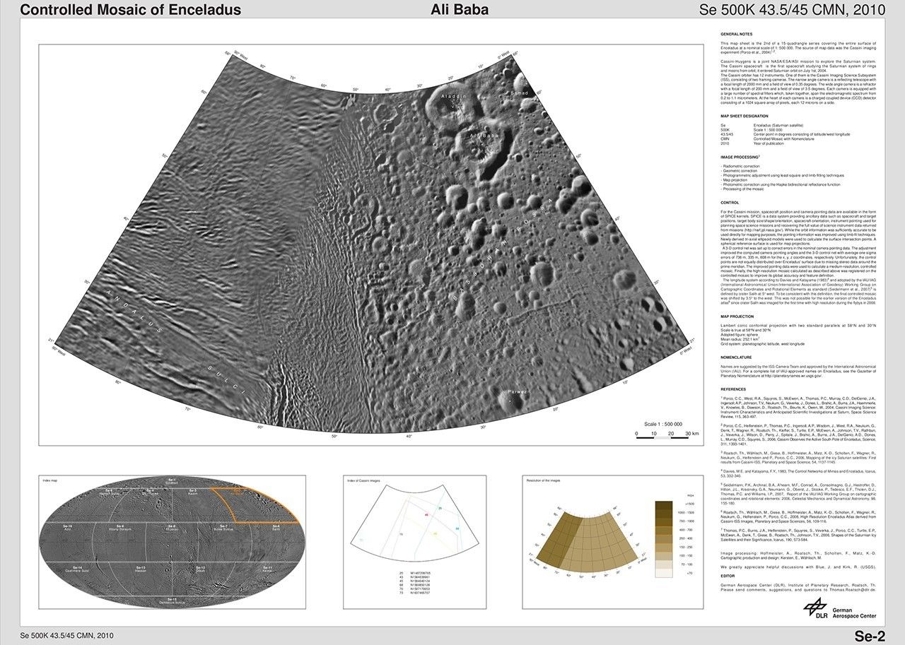 The map sheets form a 15-series covering the entire surface of Enceladus at a nominal scale of 1:500,000. An index for the atlas is included here, along with an unlabeled version of each terrain section. The map data was acquired by the Cassini imaging experiment. The mean radius of Enceladus used for projection of the maps is 252.1 kilometers (156.6 miles). Names for features have been approved by the International Astronomical Union (IAU).