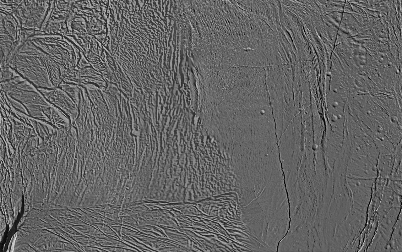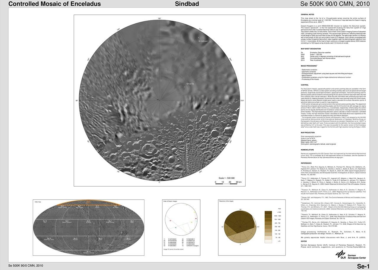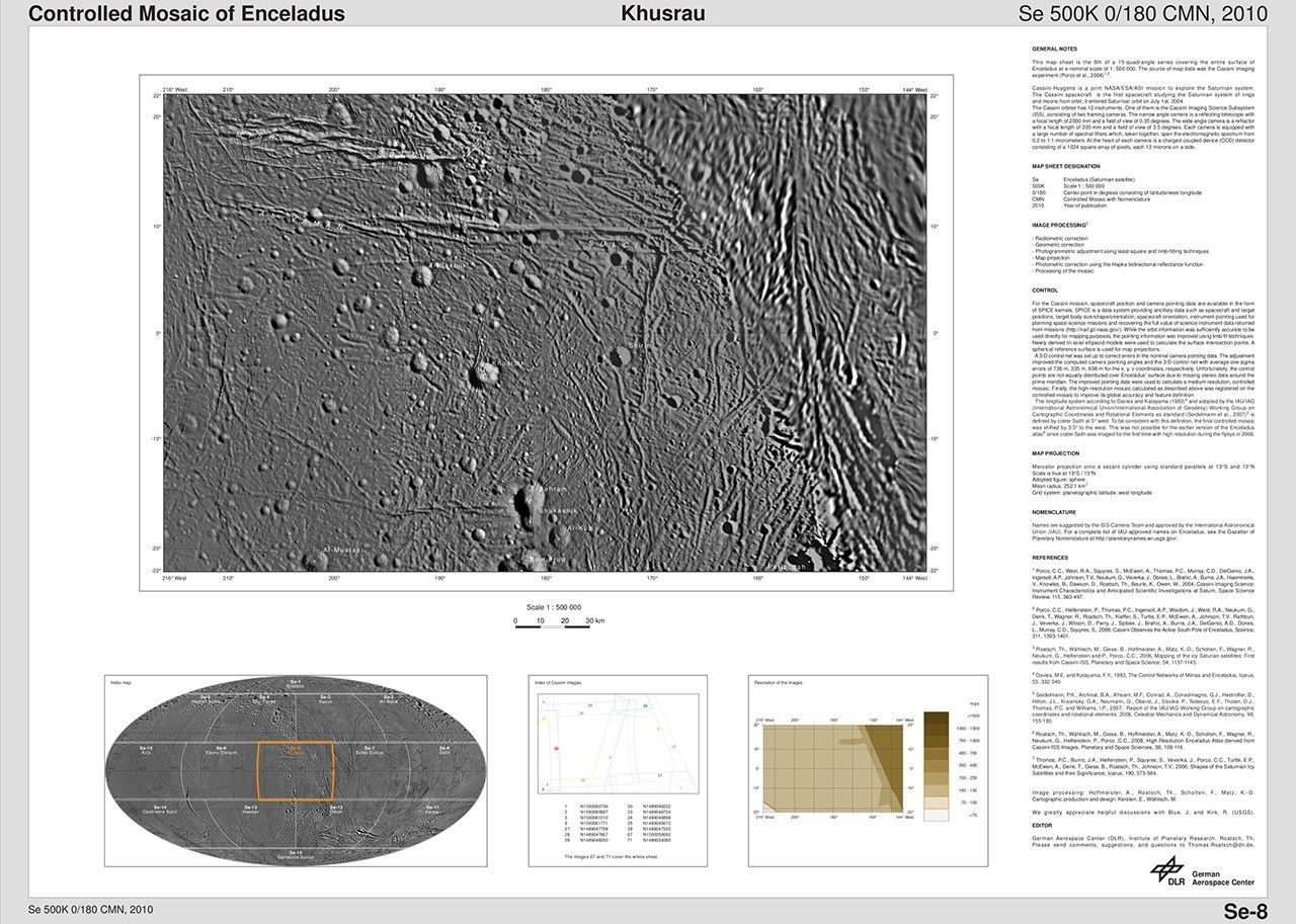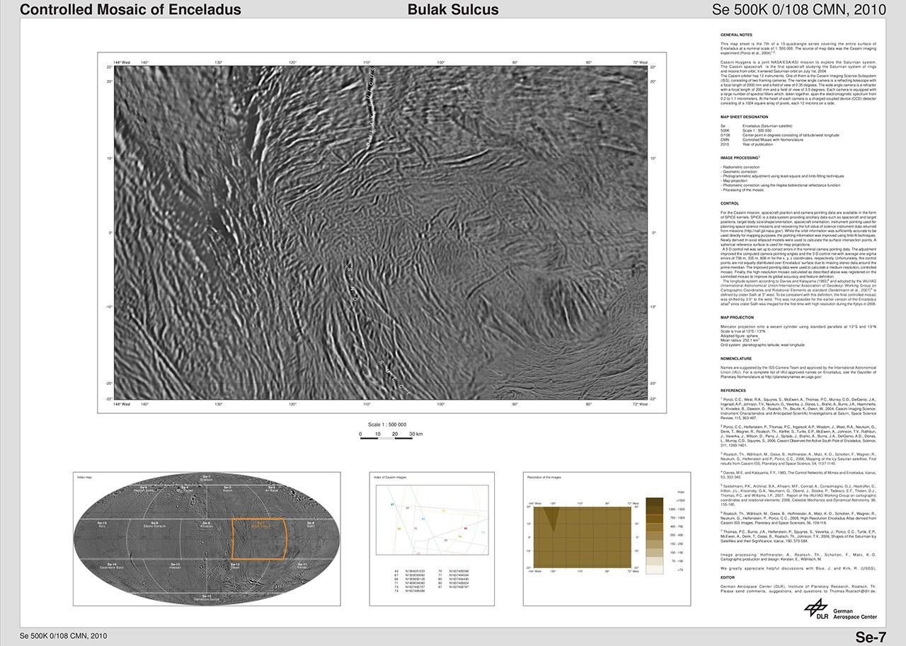 The map sheets form a 15-series covering the entire surface of Enceladus at a nominal scale of 1:500,000. An index for the atlas is included here, along with an unlabeled version of each terrain section. The map data was acquired by the Cassini imaging experiment. The mean radius of Enceladus used for projection of the maps is 252.1 kilometers (156.6 miles). Names for features have been approved by the International Astronomical Union (IAU).