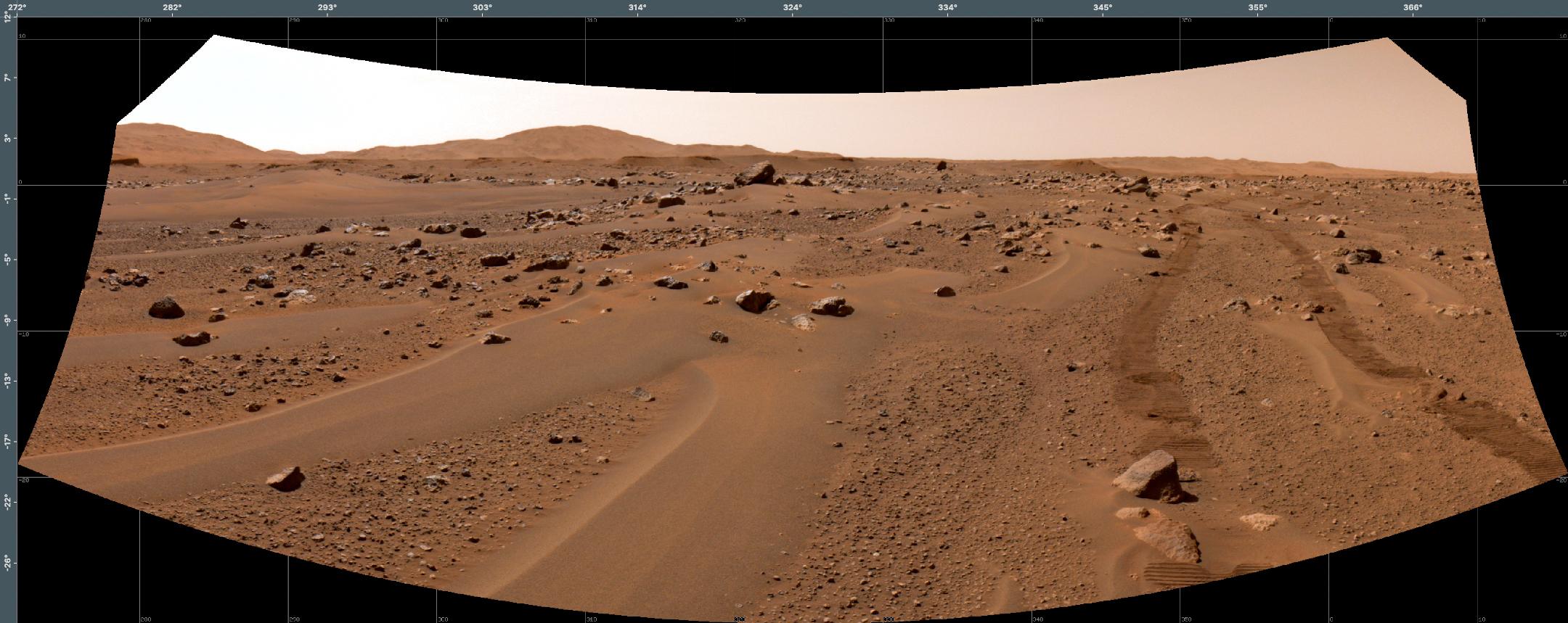 This image of a Martian vista in Jezero Crater, made from smaller individual images, was taken by NASA's Perseverance rover on July 3, 2021 (the 131th sol, or Martian day, of its mission). The rover's tracks from its autonomous drive that day are visible on the right. The images that compose the larger mosaic came from the rover's Navigation Cameras and were processed to enhance the contrast.