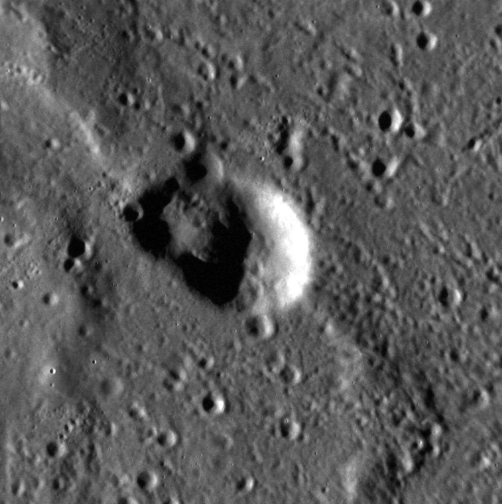 Today's image was acquired at an "MET" of 129,781 seconds, or a day and a half after the count started over. This image shows an interesting crater in the Caloris basin. Craters of irregular shape are often thought to be formed from processes other than impact events, but this crater could be a cluster of several smaller craters or its shape could have been modified by the wrinkle ridge that crosses the scene from northwest to southeast. North is up in this image.