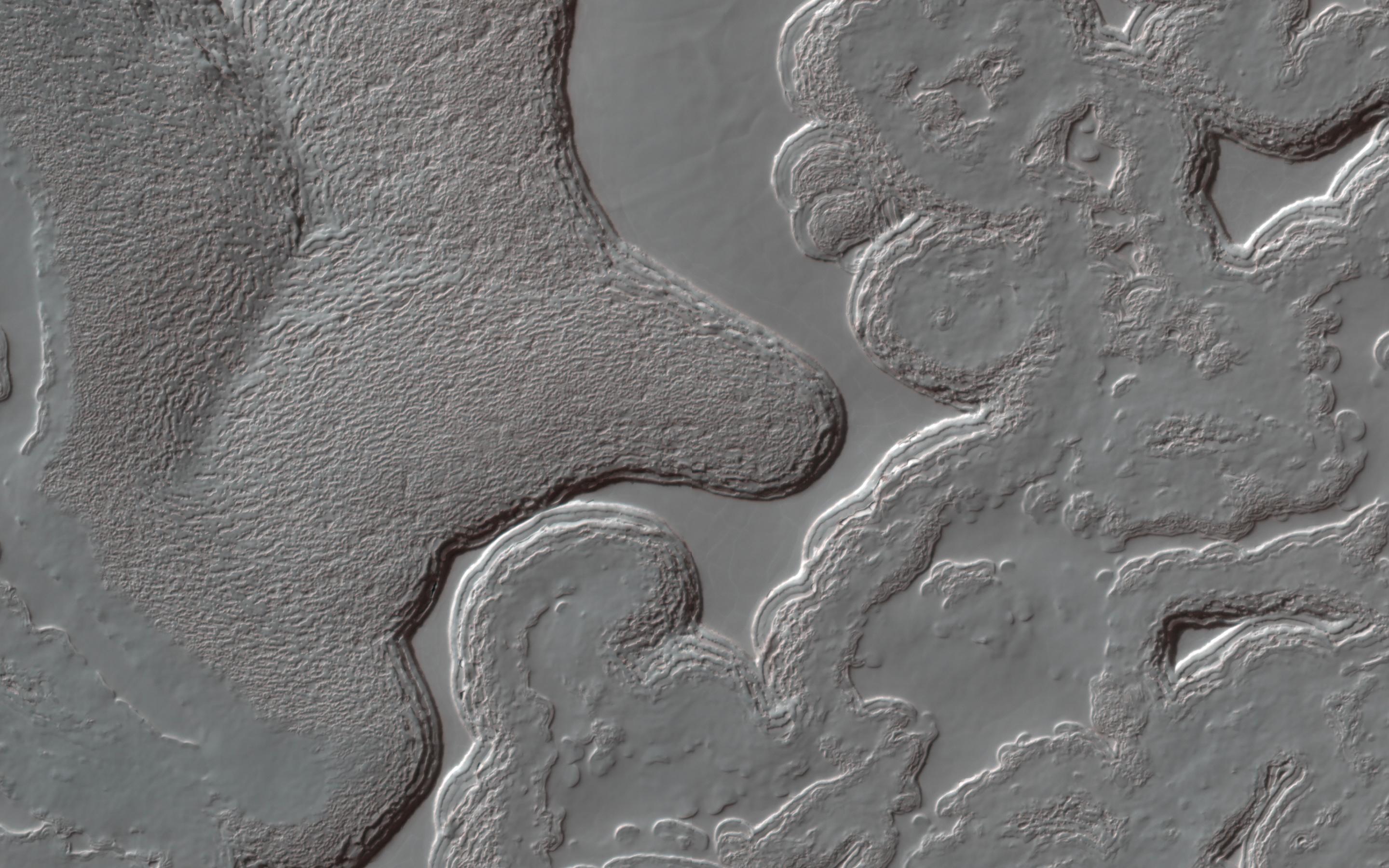 HiRISE monitors many areas of the cap to study these changes. Usually when we study changes, we can align the images with features that haven’t changed, but here that is difficult: nearly everything is different! By lining up the pattern of shallow pits on top of a mesa, which are not changing much, we can see the variations in the eight Mars years between observations (PSP_004992_0945 and this one). Some of the walls have retreated by more than 15 meters (about 50 feet).