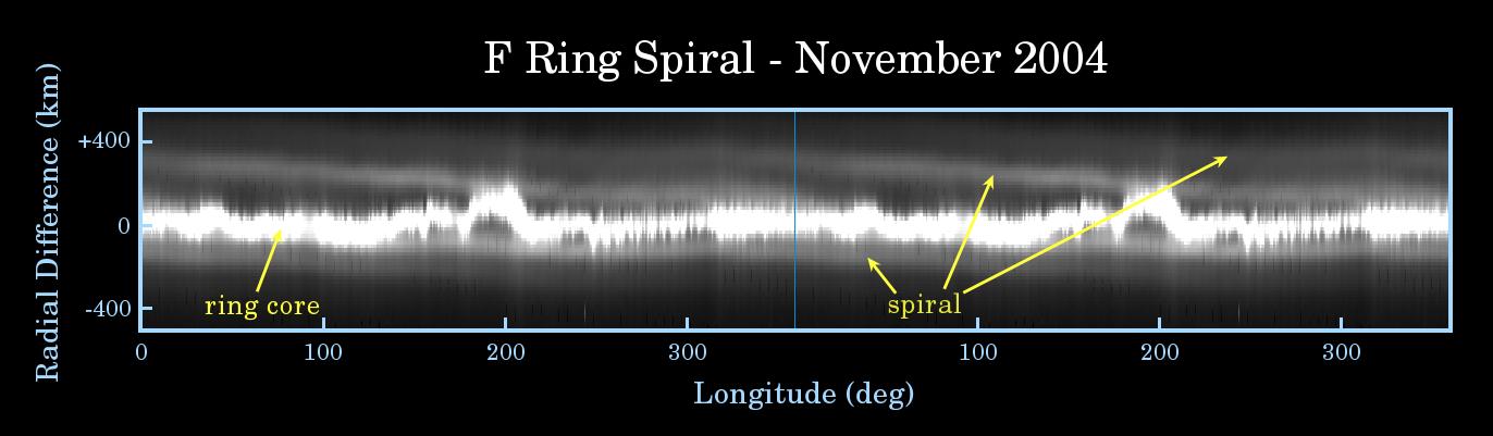 In contrast, the F ring spiral structure contains very little mass and appears to originate from material somehow episodically ejected from the core of the F ring and then sheared out due to the different orbital speeds followed by the constituent particles.