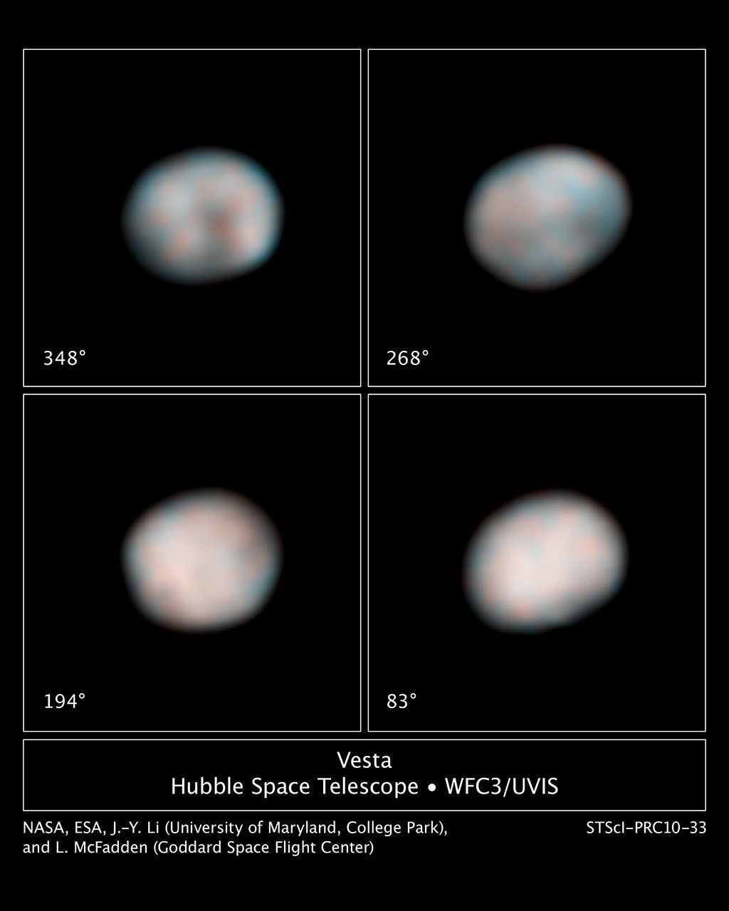 Each of the four Hubble images captures views of Vesta during its 5.34-hour rotation period. Hubble's sharp "eye" can see features as small as about 40 kilometers (25 miles) across in these images. Vesta was 211 million kilometers (131 million miles) from Earth when Hubble made the observations.