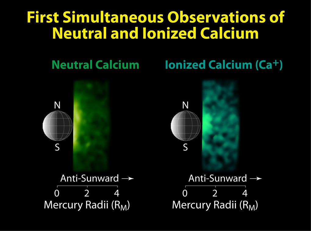 Shown here are the first observations of emission from ionized calcium in Mercury's tail region compared with simultaneous observations of neutral calcium. Neutral calcium is rapidly converted to ionized calcium by sunlight, explaining the generally rapid decrease of neutral calcium away from the planet. The high degree of correlation between the two observed distributions reflects the rapid conversion of neutrals to ions and demonstrates that ionized calcium represents a significant fraction of the overall calcium abundance. Simultaneous measurement of the abundances of calcium neutrals and ions is therefore necessary to determine accurately the total calcium abundance in Mercury's exosphere. This situation is in contrast to that for sodium and magnesium, which are ionized much more slowly. The significantly longer lifetime for neutral magnesium may explain why its abundance is more widely distributed in the tail region than calcium.