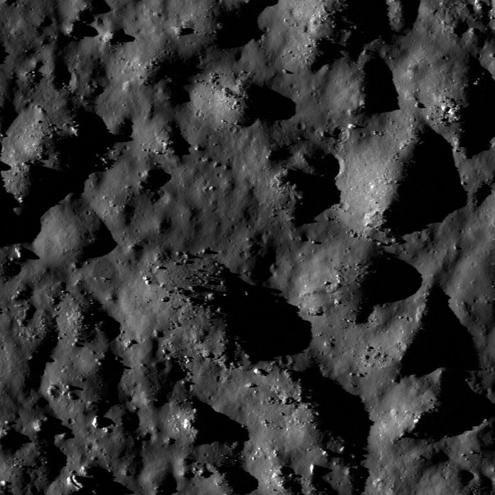 Boulders and impact melt line the floor of the 85-km crater Tycho, a potential site for future human exploration. Tycho crater is one of the fifty regions of interest in NASA's Constellation Program. Scene width is 620 m.