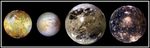 In this "family portrait," the four Galilean Satellites are shown to scale. These four largest moons of Jupiter shown in increasing distance from Jupiter are (left to right) Io, Europa, Ganymede, and Callisto.