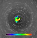 The Cassini data presented in this view appear to confirm a region of warm atmospheric descent into the eye of a hurricane-like storm locked to Saturn's south pole. The view shows temperature data from the Cassini spacecraft composite infrared spectrometer overlaid onto an image from the imaging science subsystem wide-angle camera.